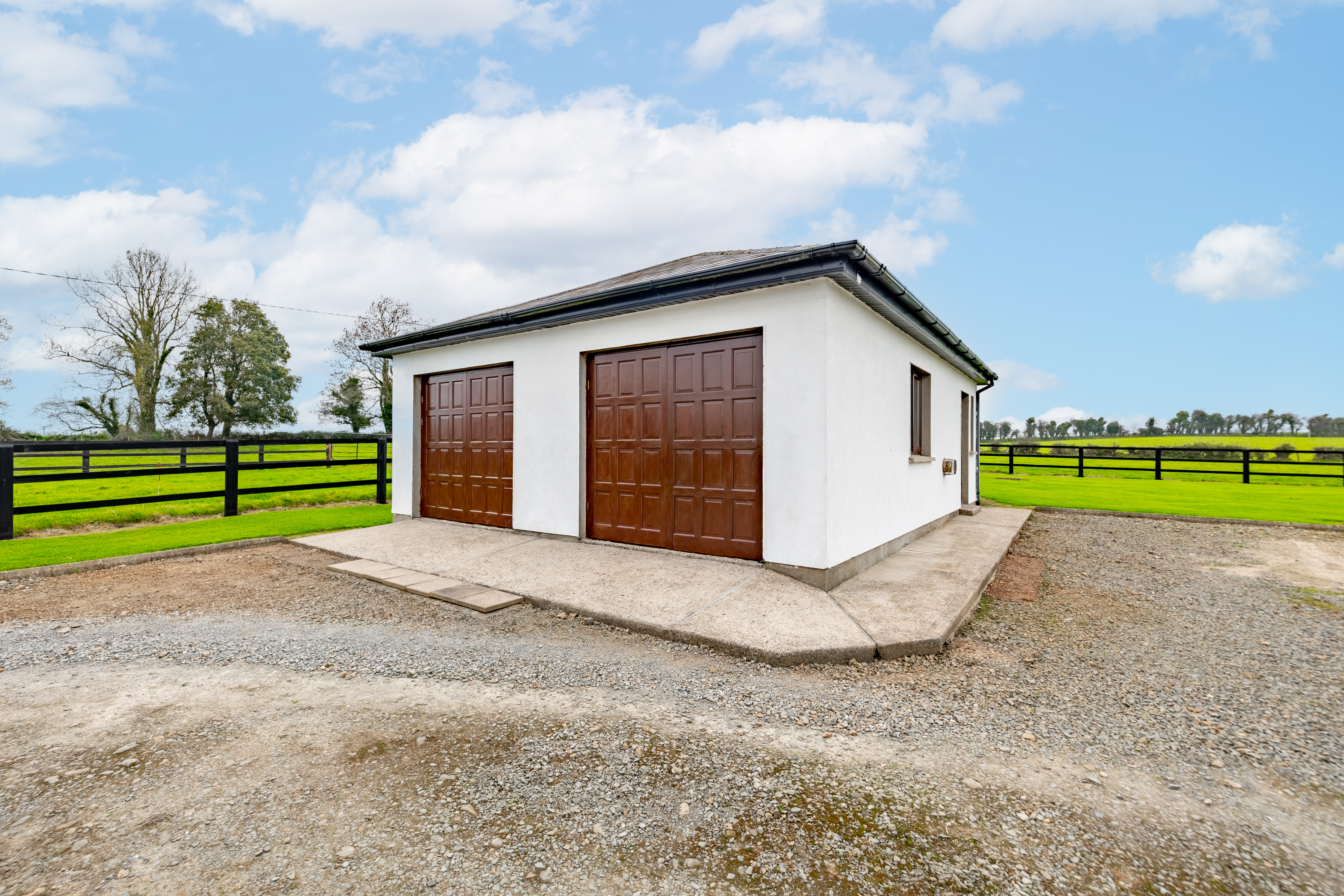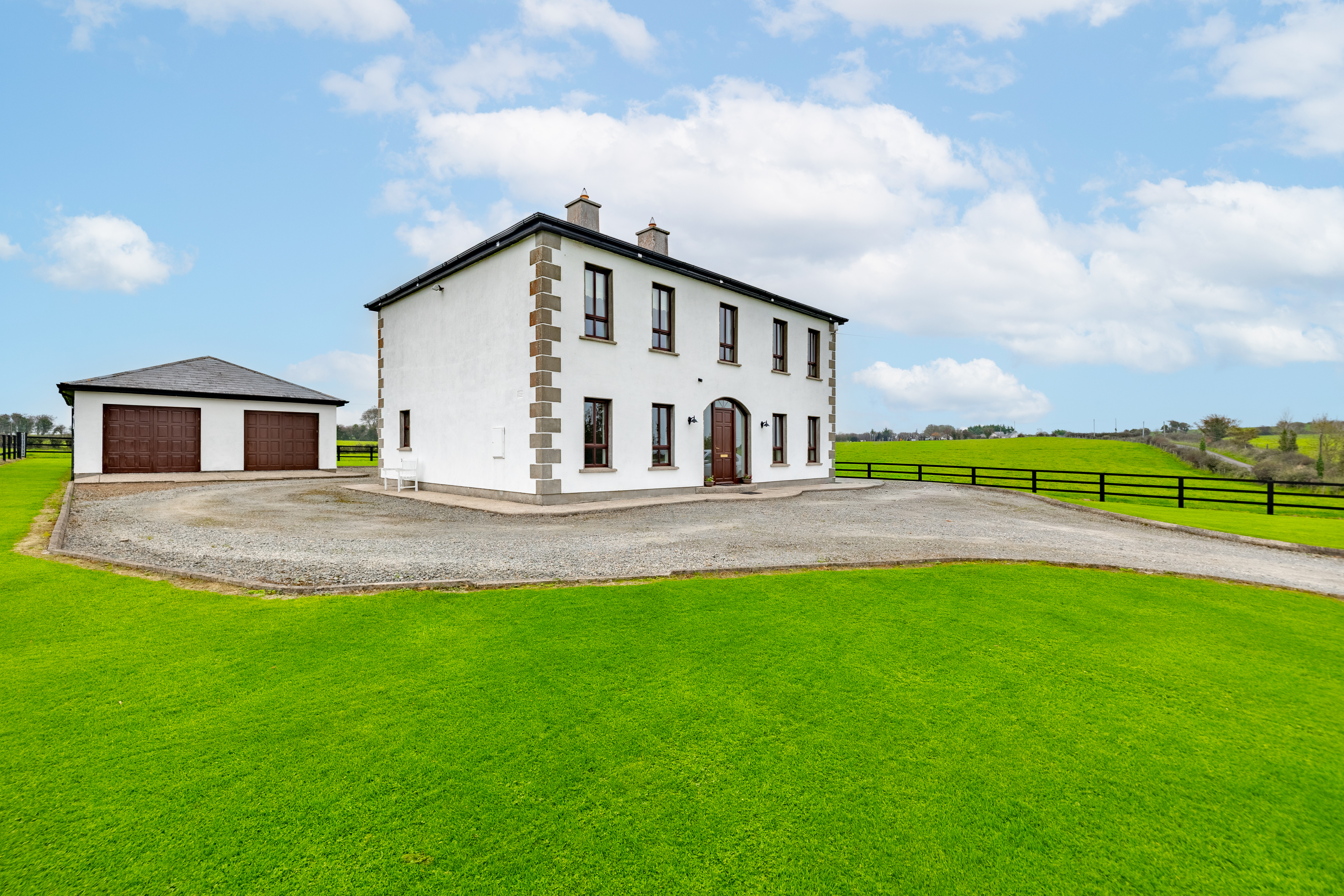 Outside, the property is approached via a private driveway and surrounded by manicured lawns bordered by elegant fencing. The detached garage offers excellent development potential, whether for conversion into a home office, guest accommodation, or studio (subject to planning permission).