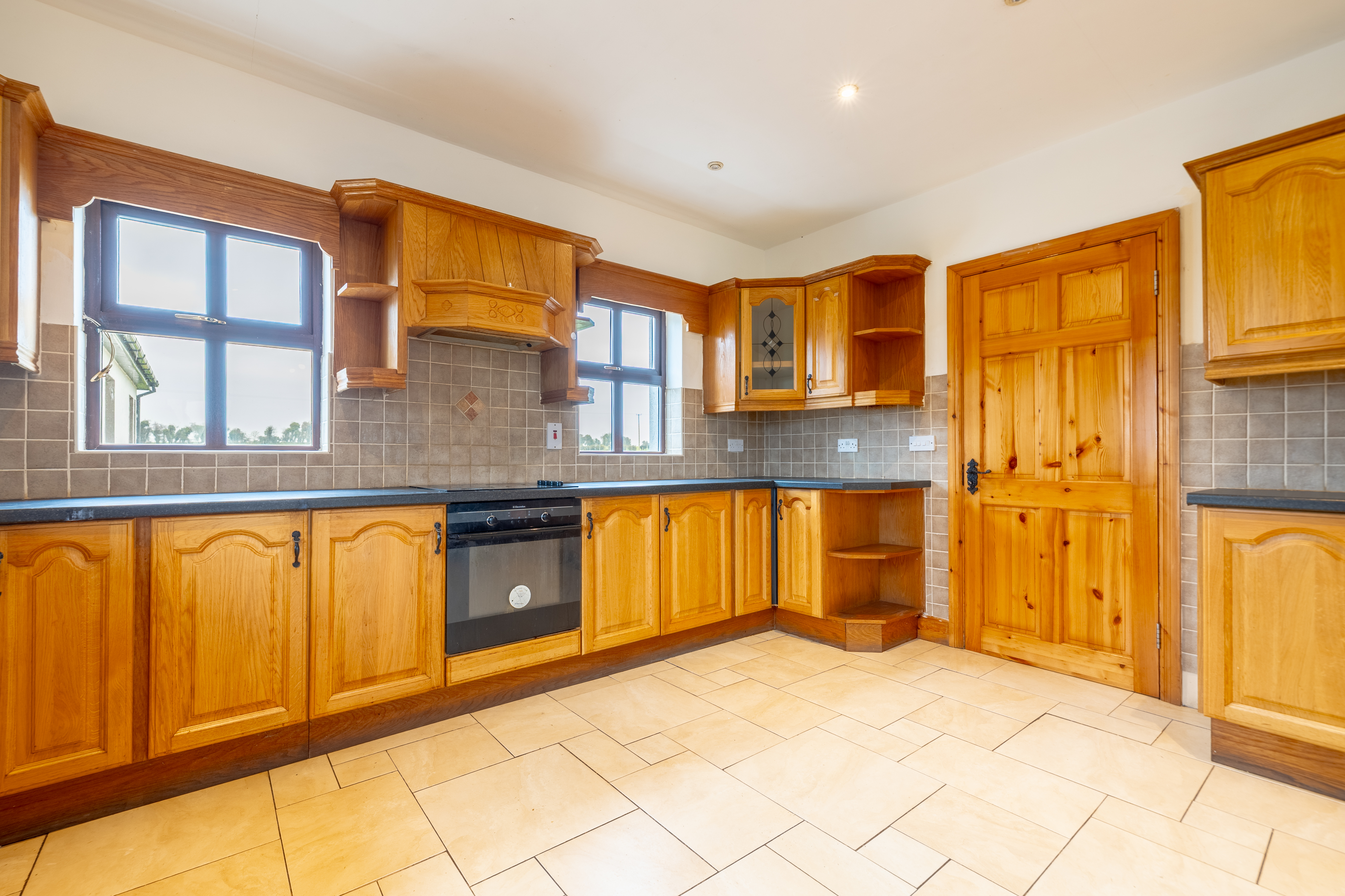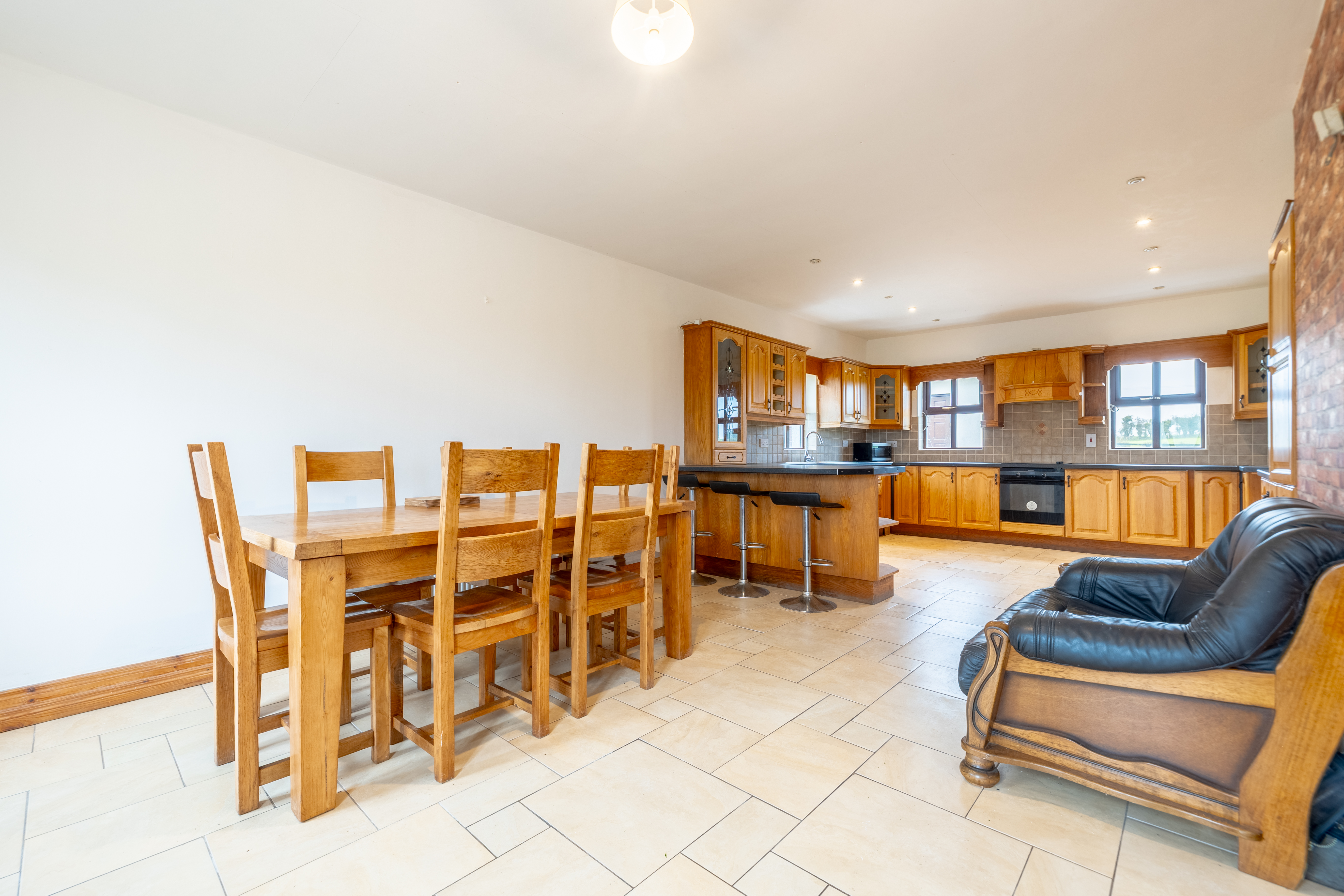 The house itself is light-filled throughout, with generous proportions and a thoughtful layout that makes it ideal for modern family living. The spacious kitchen, featuring solid wood cabinetry, tiled flooring, and ample counter space, serves as the heart of the home — the perfect setting for cooking, dining, and entertaining.
